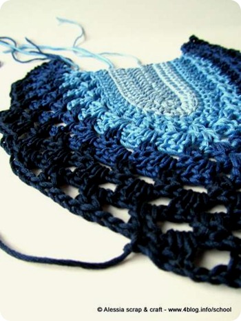 Questo è un pezzo della lavorazione e i colori che ho scelto sono complementari a quelli del primo modello, questa volta colori freddi ma sempre pastosi composti con i cotoni lucidi e morbidi che uso di solito per tanti progetti.