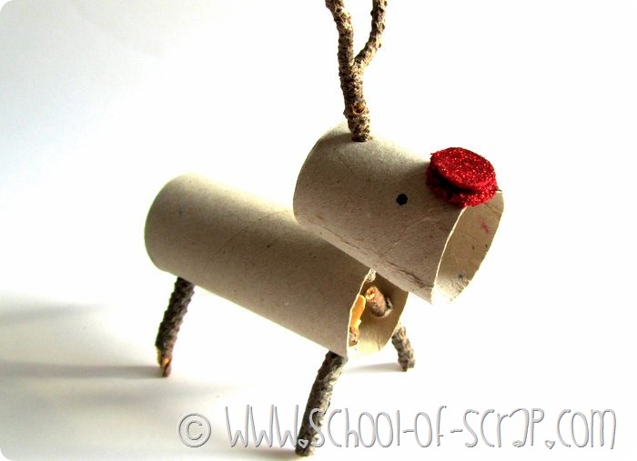 Con un po’ di pezzi di ramo e dei tubi di cartone ecco che è nata la renna di babbo Natale, il naso rosso glitterato non può mancare